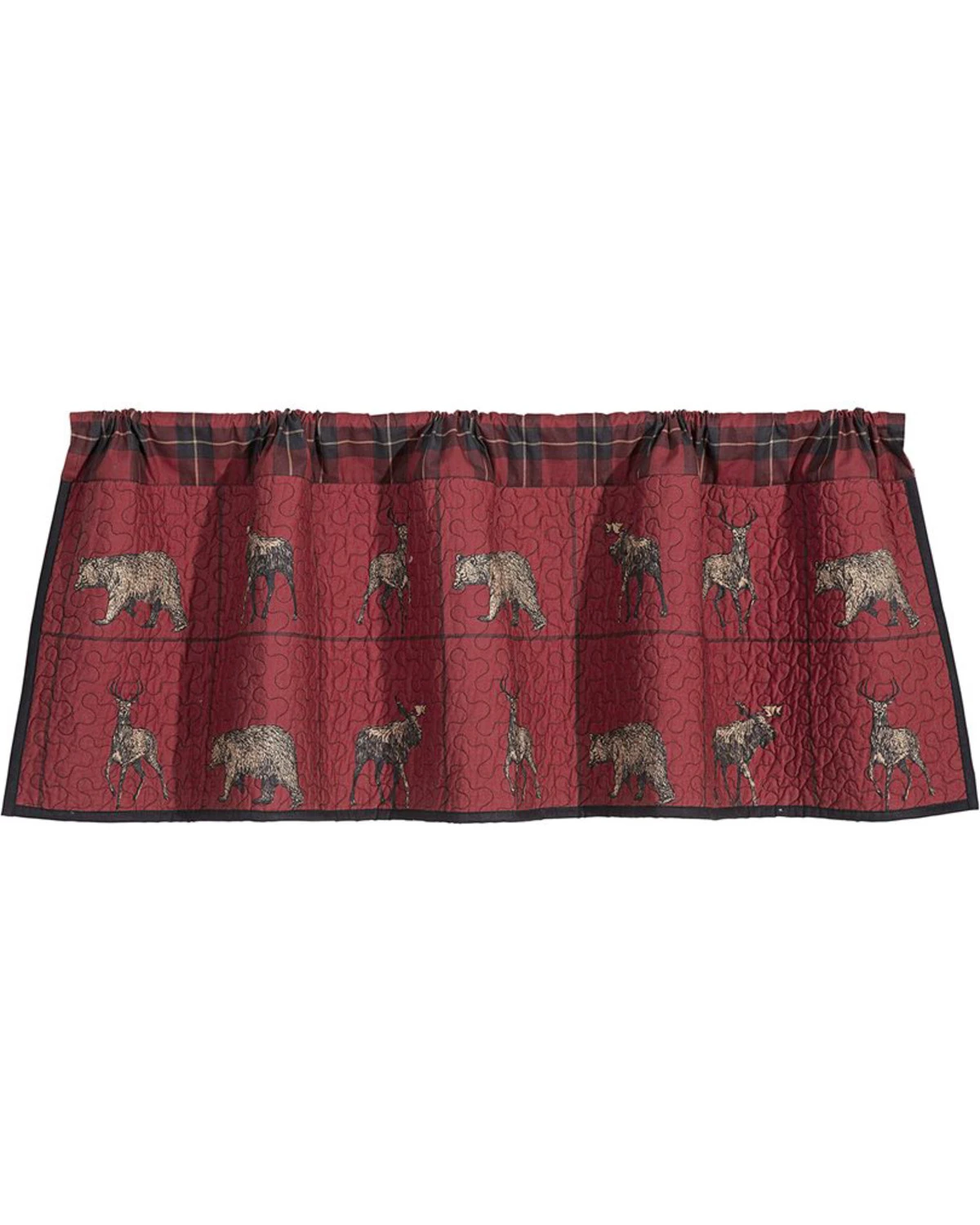 This quilted woodland plaid valance is the perfect rustic touch to any house or cabin. This valance features deer, moose, and bears for a unique, outdoors feel. Measures 84X18″.Â
